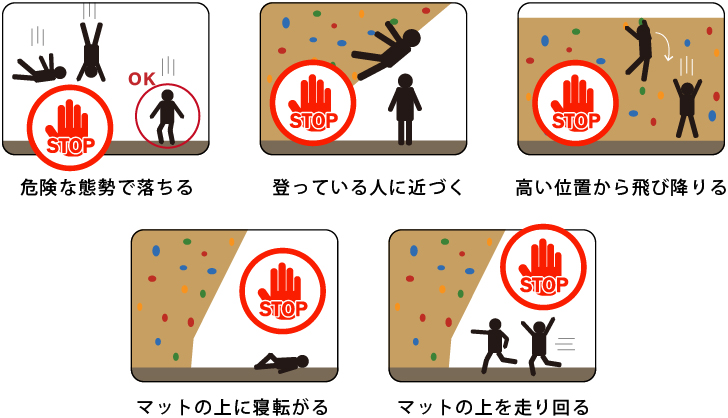 ボルダリングは危険を伴うスポーツです。マナーを守り下記の危険な行動を理解した上で必ずスタッフの指示に従ってご利用下さい。